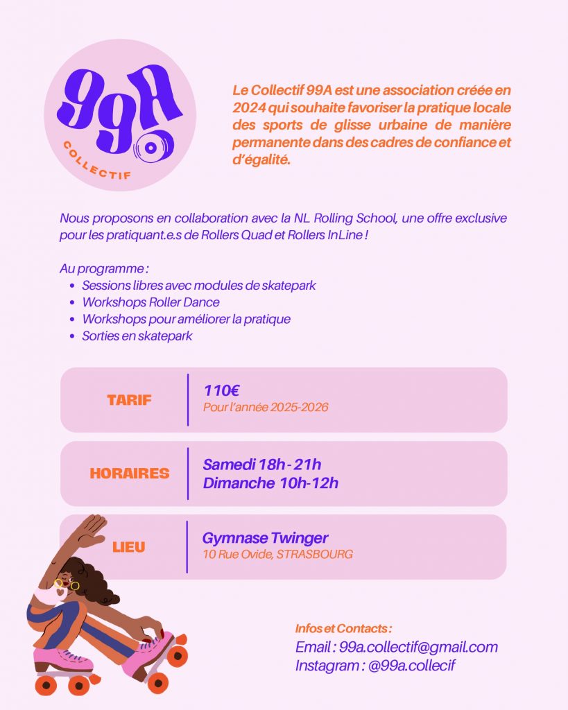 Pour les cours Girls & more* roller quad , il faudra se rapprocher du « Collectif 99A », vous trouverez toutes les infos à ce sujet ci-dessous.